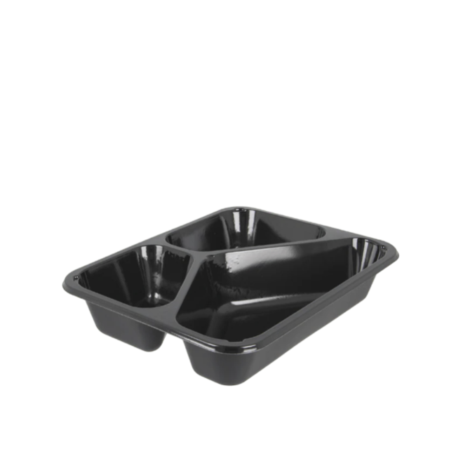 Het cpet maaltijdbakje 3-vaks zwart is een veelzijdige plastic menubak. Maaltijdbakjes van cpet zijn ideaal voor het veilig en traditioneel verpakken van bezorgmaaltijden, afhaalgerechten en kant-en-klaarmaaltijden. De stevige maaltijdtrays zijn gemaakt van zwart, glanzend CPET met een luxueuze uitstraling. Doordat dit materiaal bestendig is tegen temperaturen van -40 tot +220 °C kunnen de bakken worden gebruikt in zowel de oven, magnetron en vriezer. Ideaal dus voor gerechten die je wilt kunnen invriezen, opwarmen en verhitten.