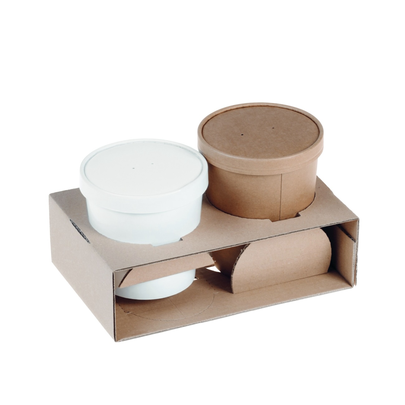 De kraft soepbeker houder van karton is speciaal voor het meegeven van onze middelgrote en grote kartonnen soepbekers. De draagtray van karton is goed vast te houden en gemakkelijk mee te dragen. Door de voorgestanste gaten plaatst u gemakkelijk 2 soepbekers in de houder. Kartonnen bekerhouders zijn te gebruiken voor het bezorgen van uw maaltijden, oosterse gerechten en soepen in onze kwalitatieve soepbekers van karton. Onze 480ml, 780ml en 960ml soepbekers passen perfect in de houders. De houder heeft een afmeting van 25x16x7,5cm en past daardoor perfect in onze middel papieren blokbodemtassen.