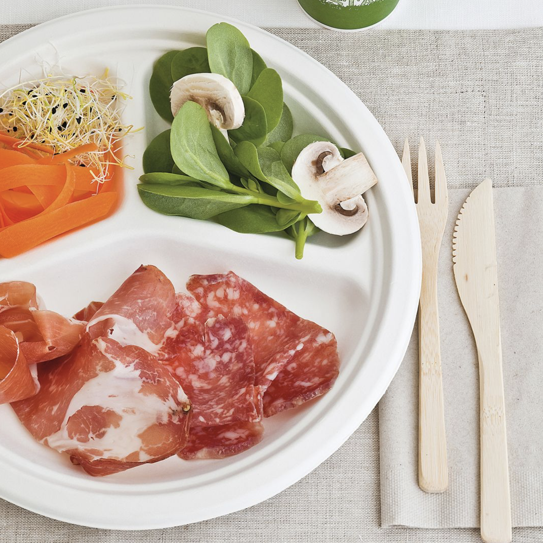 Suikerriet borden zijn ideaal voor gebruik tijdens een bbq, evenement en walking diner. Ze zijn licht in gewicht, stevig en geschikt voor warme en koude toepasingen. Suikerriet bord 23cm rond 3-vaks heeft een strakke uitstraling. Doordat de wegwerpbordjes wit zijn komen uw kleurrijke gerechtjes mooi tot hun recht op deze bordjes van 23cm. Dit bordje voor eenmalig gebruik wordt veel gebruikt als diner bordje tijdens bbq’s, foodtruck evenementen en partijen. De milieuvriendelijke borden met vaksverdeling liggen stevig in de hand en hebben een aangenaam gevoel. De borden van suikerriet zijn verkrijgbaar in diverse maten waardoor ze o.a. te gebruiken zijn als gebaksbordje, voor kleine en grote maaltijden en gewoon bij een barbecue thuis. Combineer wegwerp bordjes met ons hout bestek en afbreekbaar plastic bestek.