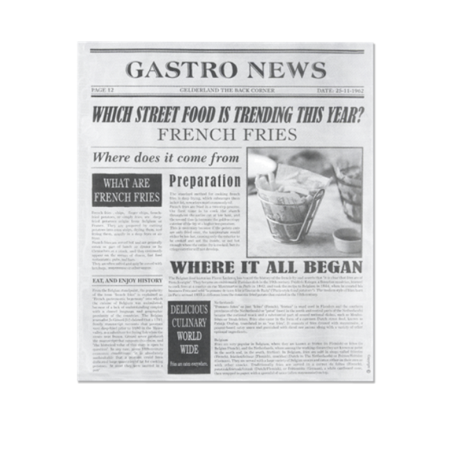 Wij bieden duurzaam wikkelpapier in verschillende formaten. Vetvrij wikkelpapier 31x36cm krant wit heeft een hippe krant print. Bedrukt vetvrij papier kopen met krant print doet u bij Eco Disposable! Wilt u liever uw eigen logo of huisstijl op het vetvrij papier bedrukken? Wij verzorgen ook vetvrij papier bedrukt met logo. Neem contact met ons op via info@ecodisposable.nl en we maken graag een vrijblijvend voorstel voor u!